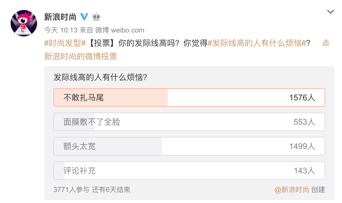 @新浪时尚 也发起了微博投票,不敢扎马尾和额头显宽是大家的痛点。