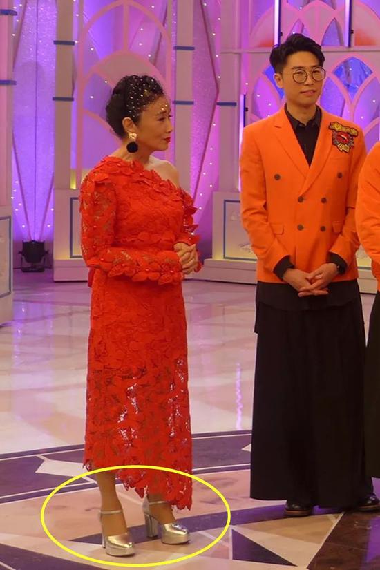 除了一袭大红裙分外耀眼外,汪明荃脚下所搭配的高跟鞋更是十分瞩目。可以看到,这次录制节目的汪明荃脚踩一双银色包头高跟鞋出镜,从整体上看起来搭配很是协调。虽然粗跟鞋比起细跟鞋要稳一些,不过目测10公分高的鞋跟还是让人忍不住小担忧了一把,毕竟汪明荃也已经72岁了呀!