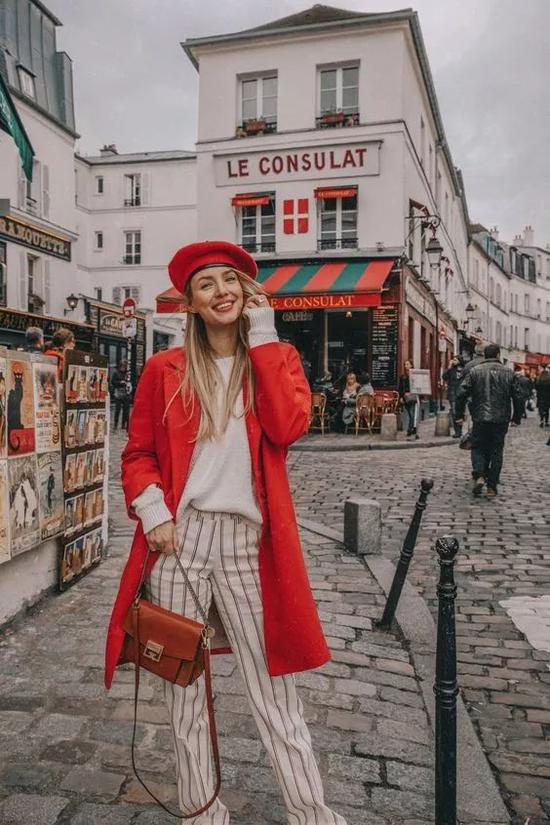 利用同色系搭配,红色贝雷帽,瞬间提升整体的摩登复古气质